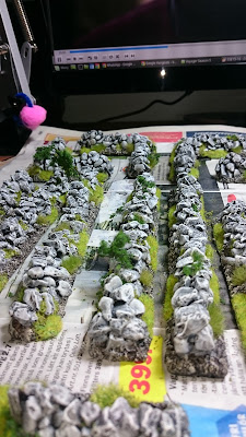 I plan to paint these quickly as they shouldn't need too much work. Black priming, grey drybrushing in a couple of layers, paint the bases brown, with some drybrushing, and some flocking. Maybe some washing in between. I'll put up some pictures and report how they paint up.